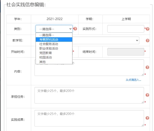 如果你还参加了其他实践活动,可以根据实际情况自行填写。比如你参加了“研学旅行”,可相应选择“考察探究活动”,实践形式填“研学旅行”
