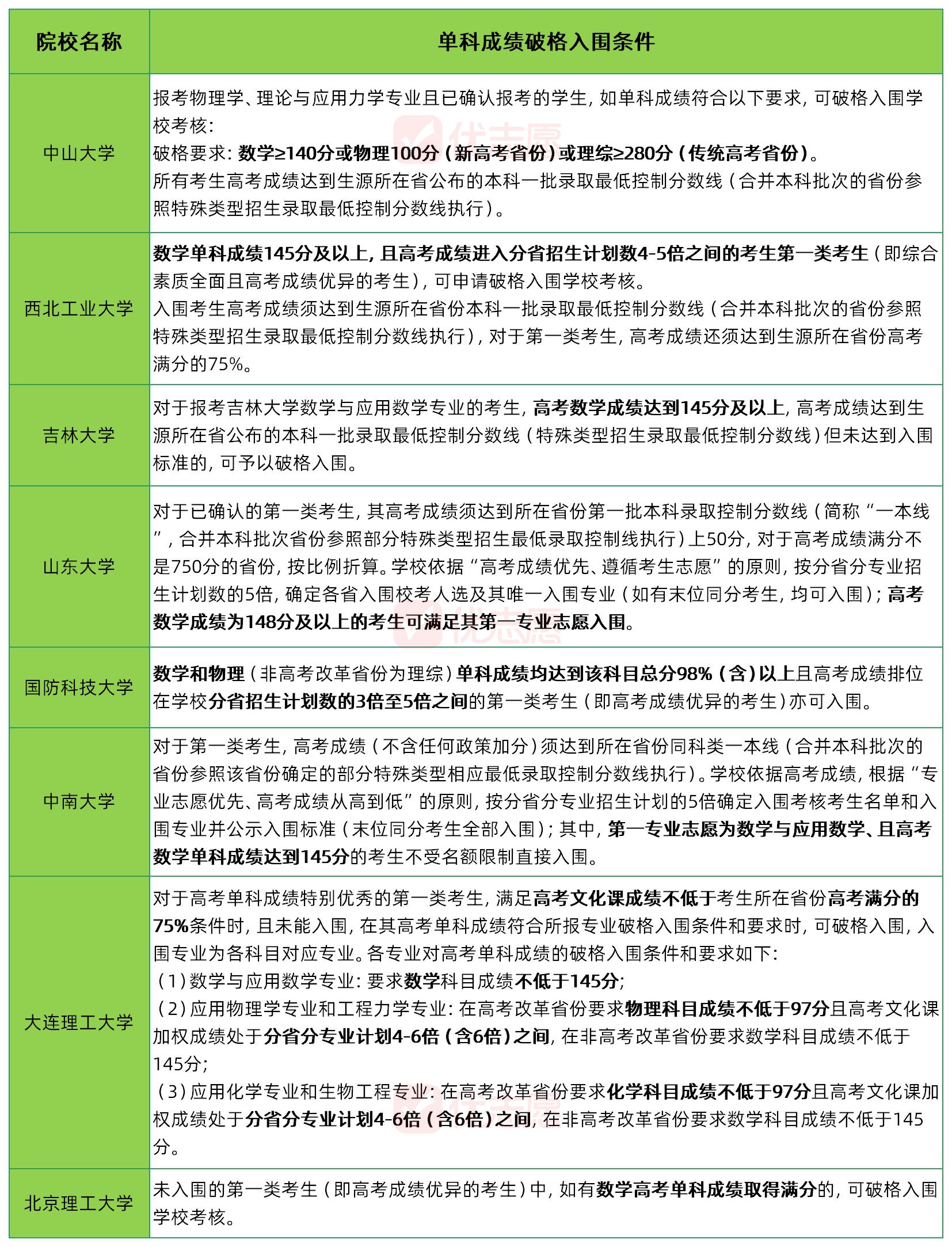 在目前实行强基计划的高校当中,绝大部分高校对获得五大学科竞赛全国决赛二等奖(含)以上奖项的学生,给予直接入围的特别待遇。然而,很多考生和家长不知道的是,单科成绩达到一定要求也可以获得学校的破格入围。对此,小优整理了一份单科成绩破格入围条件的学校名单及相关要求,具体如下: