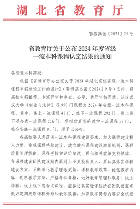 近日,湖北省教育厅发布了《2024年度省级一流本科课程认定结果》的通知,