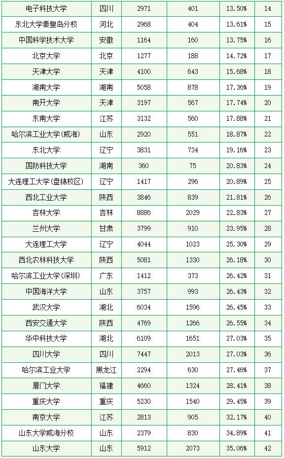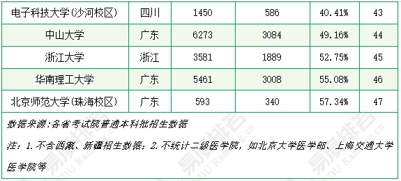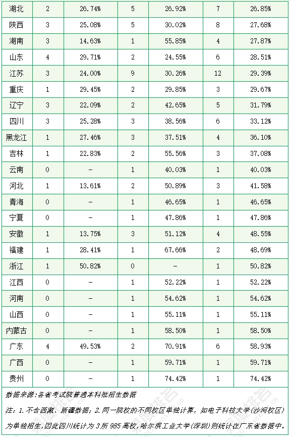 本省计划占比较高的多为江西、河南、广西、贵州等教育资源匮乏的省市。这些省份985、211院校数量稀少,本省考生的报考需求都无法满足,更不要说把大量的计划投入到省外。而广东省虽然教育资源丰富,但考生人数众多,仅次于河南,高考难度可想而知,为保障本省考生的权益,也选择将更多的计划投放到省内。