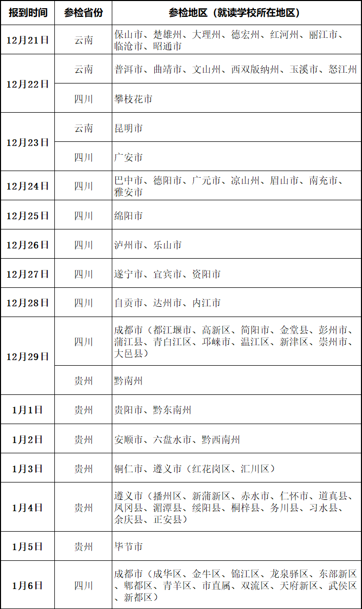 根据2025年度招飞工作安排,计划于12月下旬至1月上旬,组织云南、贵州、四川部分初选合格考生参加招飞复选检测。参检对象以成都招飞中心下发的《复选参检考生名单》为准,《名单》现已转发各招考部门,由各招考部门通知相关学校,组织学生按要求参检,无故不参加复选检测的视为放弃!!!