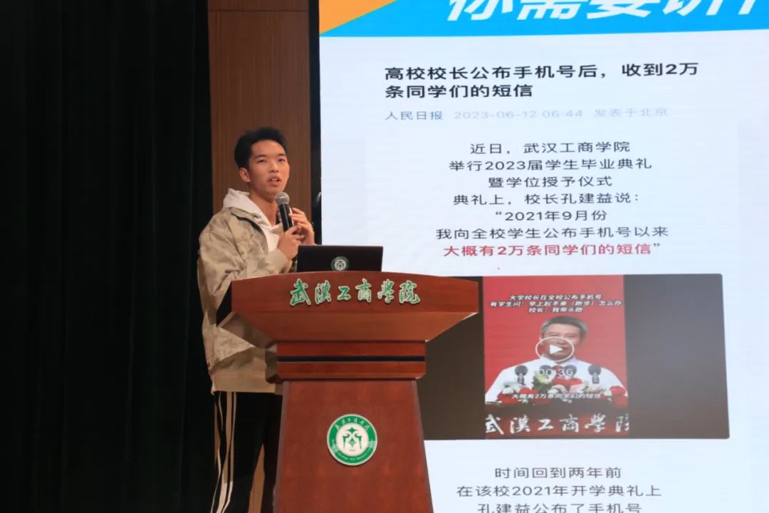 管理学院四川南充白塔中学实践队的舒潇同学以“把最美的武工商带回家,把最优秀的自己带回家”为主题,分享了单人执行活动的宝贵经验。他回顾了自己从分析高中管理的实际情况入手,在与老师多次沟通后,确定了符合高中生作息时间和学校管理要求的活动方案的过程,并总结了可供其他团队借鉴的、适用进班宣讲的流程体系。从发言中,能深刻感受到他对高中母校、对武工商的真挚情怀与担当。