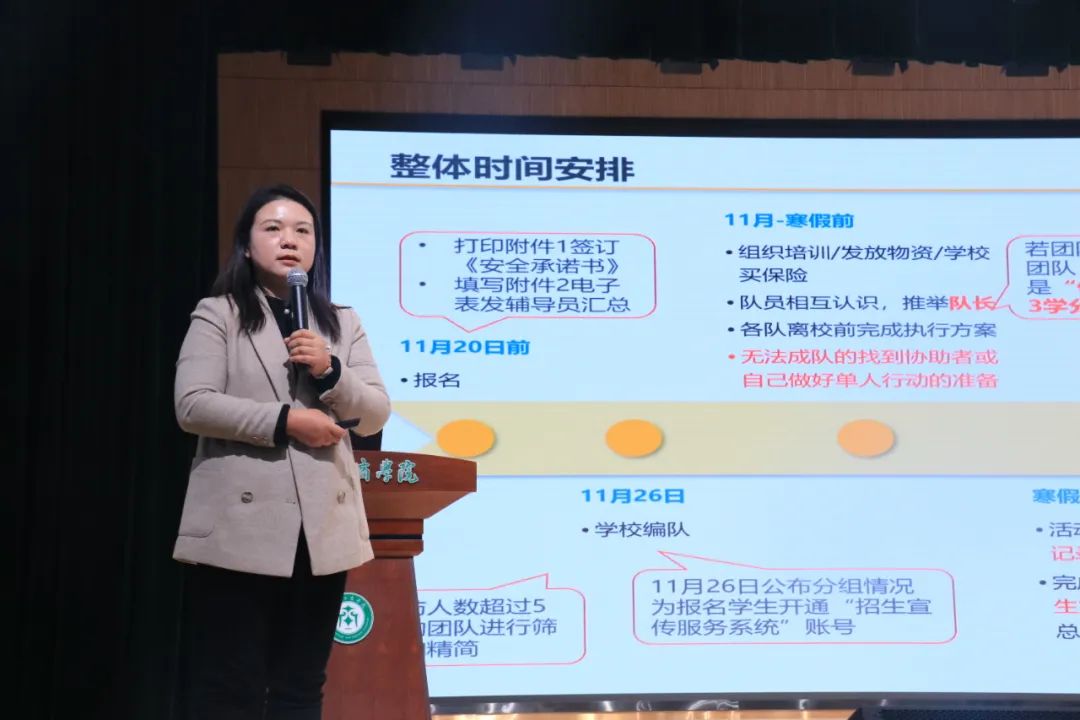 最后,梅归归老师培训了实践活动的整体安排、配套支持、宣传管理系统操作指南及考核要点,对各团队回访高中的工作纪律、前期准备、执行过程、总结复盘等方面提出了明确要求。