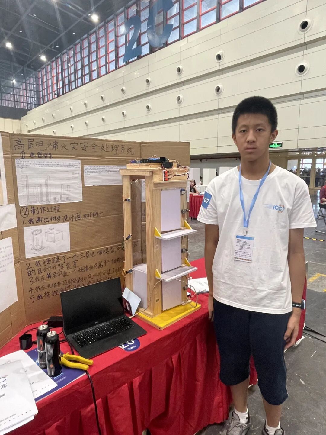 “火灾事故中,大多数人员死亡由浓烟导致,而电梯井会加速浓烟的散播,解决这个问题很有必要。”在比赛现场,武汉市第一初级中学初三学生邹乐辰演示了自己设计的“高层电梯火灾安全处理系统”:随着传感器检测到模拟烟雾,具有防烟功能的电梯防火门迅速关闭,电梯井顶部的排风机自动开始工作,驱散烟雾并制造负压环境,加强防火门的密闭性。