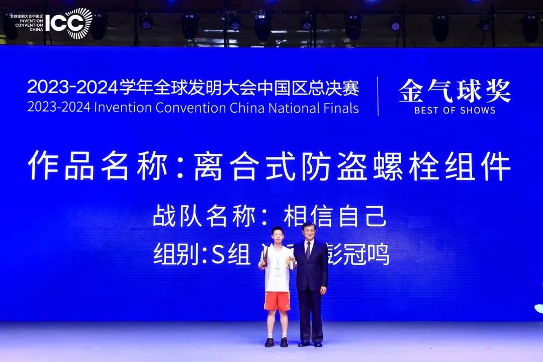 最终,山东省潍坊第一中学未来实验校区高三学生彭冠鸣获得全场最佳奖“金气球奖”。他设计的“离合式防盗螺栓组件”利用单方向传递扭矩的原理,提高了螺栓组件的防盗性能,具有成本低、易推广、简洁实用等优点。