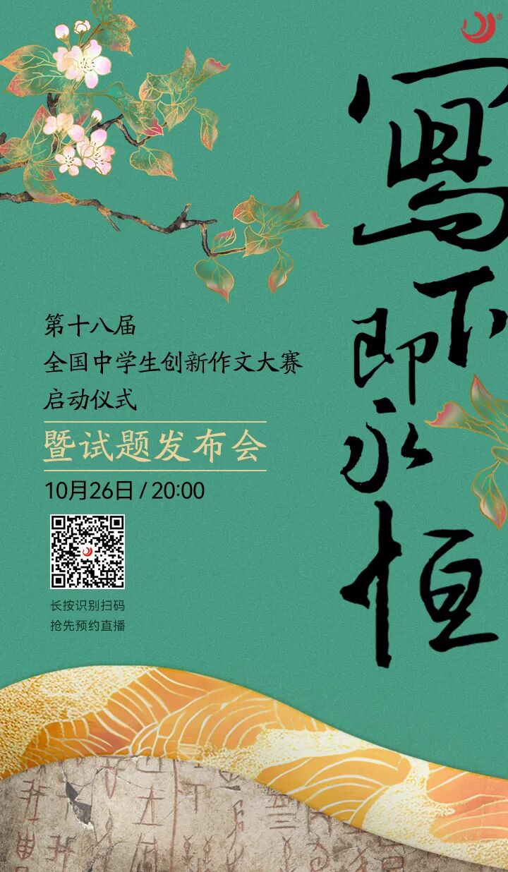 第十八届全国中学生创新作文大赛启动仪式暨试题发布会将在10月26日晚20:00以线上形式正式举行!