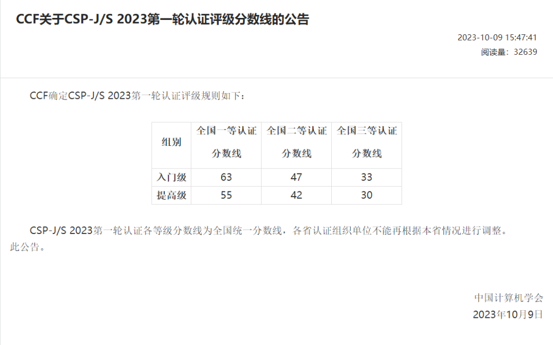 还有另一个容易让我们混淆的词语🏆【获奖】获奖,是两轮认证都会产生的。CSP-J(入门级)和CSP-S(提高级)第一轮认证结束后, CCF会给出全国一等、全国二等、全国三等的分数线。选手可以根据此分数线判断自己在初赛认证中能获得什么奖项。