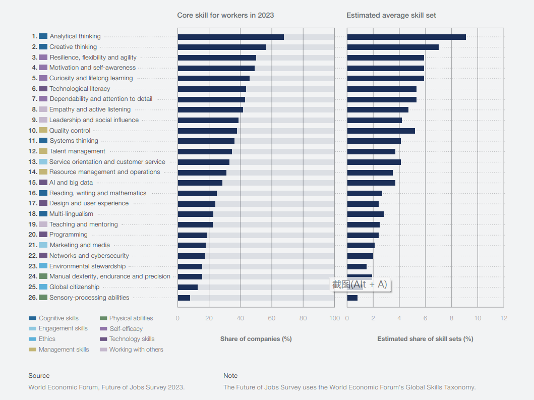 世界经济论坛发布的《2023年未来就业报告》,指出了2023年-2027年企业期望员工具备的核心技能。