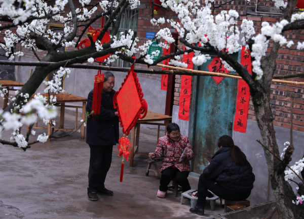 作品描述:春天到了,老奶奶房前屋后开满了李花,老奶奶坐在门前,扎着鞋垫,非常的开心幸福。