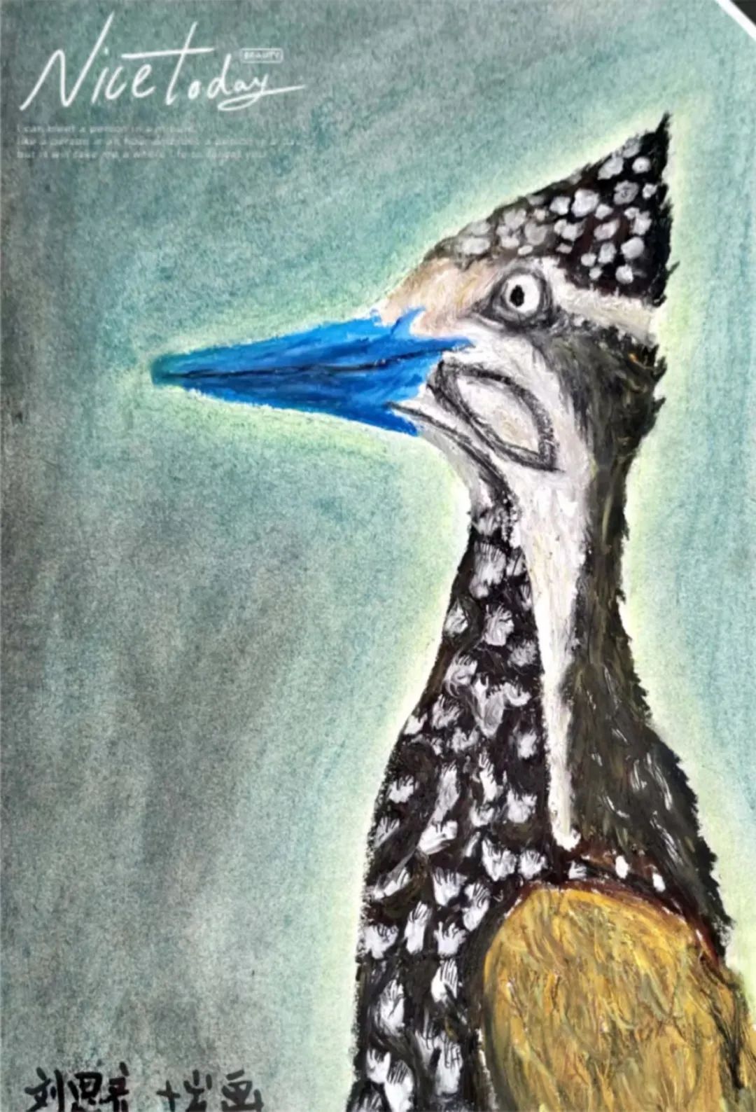 萧鹏老师点评:这幅作品画出了鸟儿外在的美好和内在的神气。用大笔触和厚画法生动表现出鸟儿的体貌特征和神态,背景用湿画法薄染,烘托主体形成了对立统一的画面效果。画风虽然稚拙,但是体现了小画家的观察力和表现力。
