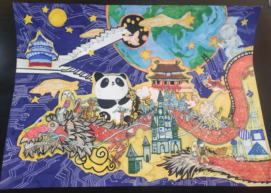萧鹏老师点评:孩子的视角是多维立体的,多彩的生活和缤纷的世界很自然的呈现在一个画面中。构图主次得当,造型丰富多变,色彩艳丽和谐。