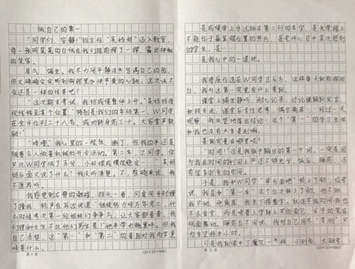 做自己的第一(决赛特等奖)河南省南阳市第二中学高三 张琬婷“同学们,安静!”班主任“吴妈妈”迈入教室,将一张明晃晃的白纸在我们眼前挥了一挥,露出神秘的笑容。屏气,端坐,我尽力让平静淡然写满自己的脸,但又确确实实听到胸腔里的心跳加快了节奏。这次该不会还是一样的结果吧?“这次期末考试,我班成绩整体上升。”吴妈妈特将视线移至某个位置,“特别是我们班的年级第一,W同学,在全市位列28名,成功跻身前30。大家掌声鼓励!”咯噔!我心里的一根弦断了。但我的手还是随着众人做着机械的开合运动。“第二名,Z同学。你只比W同学低了5分,成绩很稳定……”吴妈妈后面又说了什么,我没听清楚。不,准确来说,我不愿再听。我感觉到右臂的触碰,扭头,同桌用手肘碰了碰我,轻声在耳边说道:“继续努力呀万年老二,什么时候考次第一给姐妹们争争气,让大家都看看,我们理科女生不比男生差!”她半带着打趣意味。但我自己清楚,这“第一”和“第二”的差距对我而言意味着什么。是成绩单上永远排在第二行的名字,是光荣榜上不能位于最显眼位置的照片,是老师心目中其次想到的学生,是……我心中的一道坎。新学期开学,我将座位选在W同学正后方,这样每天就能探个明白,我与这第一究竟有什么差距。课堂上端坐静听,耐心记录;讨论课踊跃发言,积极交流;课堂后专注思考,偶尔离席……经过观察,我失望地得出结论:这个“第一”的学习生活和我也没有太多差别嘛。差距究竟在哪里呢?“时间!”这是我脑中蹦出的第一个词。一定是因为我在时间的利用上还不够充分,饭后,睡前,还有很多扩充的空间。于是,我和W同学单方面地较上了劲。他不动,我也不动;他离席,我坐下接着学。就连早饭时间我也不去食堂,而是啃着上学路上买的面包,右手的笔在纸面舞动。睡前自不用说,我对自己用尽“苦刑”,只为多坚持半小时。可我就像中了魔咒一样,小测验,大联考,还是同样,让我屈居第二名。该怎么办呢?这天,正前方那个一直低着头突然抬起,W同学直立转身:“同学们,你们看到我的英语笔记了吗?”后方几位同学一致摇头,我也附和道:“你再找找看。”但我的手触到抽屉里那个厚厚的硬皮笔记本。W同学失望地环视四周,我急忙低下头,不让涨红的脸颊落入他的视线。在此之前的我一定没想到,我会用这种低劣卑鄙的手段去竞争那个名次。只是我更加迷茫了。回到家后,我翻看W同学的笔记,字迹工整,批注细致。头顶的风扇呼呼吹动,在我耳边嗡嗡作响。我还是推开了办公室的门。“老师,我要怎样才能进步呀?”和老师面对面时,我竟感到舒心了一点,“一直以来,我努力追赶,但怎么也无法考取第一。哪怕一次也好,我想要证明自己……”班主任拉我坐下,轻声细语道:“孩子,老师一直不知道你会有这样的想法。你没有注意到自己一直以来的进步吗?刚入学,到今天,你踏踏实实地努力学习。在老师和同学眼里,你已经很了不起了。”我随着老师手指的地方看去,同学们每一次的成绩都被班主任保存下来,当然也有我的。一行行数字时有波动,但如平缓山地,逐渐上升,直到今天高度。“名次不代表一个人所有的学习情况。你们在跑800米的时候,总有一个能力领先的‘领头羊’,一直跑在最前方。团队跟随着他的步伐,也能跑得又快又稳。”老师拍了拍我的肩膀,“而你,一直跟着领头羊奔跑,稳步向前,也一定能有辉煌的明天!”我一时无言,用力地点了点头。回想最近自己的想法做法,只觉羞愧。“你可以做集体的第二,但你一定要不断前行,做自己的第一。”老师这句话,一直留在我心底。我将笔记本归还,向W同学道歉。他轻松地笑了笑,并没在意:“没关系,以后我们集体共同努力,大家最终目标都是一致的——高考。我也期待你超过我的那一天!”我觉得长久以来的重担终于落下,心里那重石的压迫感也消失了。名次不代表一切,我在前进。之后的考试,我不再为“第二”苦恼,因为我知道,我要做自己的第一!(指导老师:林华)【点评】本文根据命题材料写作,以自己学习成绩总是排在第二名的经历,表达了对于“第一”与“第二”的态度,不仅描写真实、生动,而且通过老师的教诲,写出了对问题的辩证思考。许多同学都以议论文体去写,而该同学写成了一篇优美的叙事散文。角度新颖,较好地表现了主题。