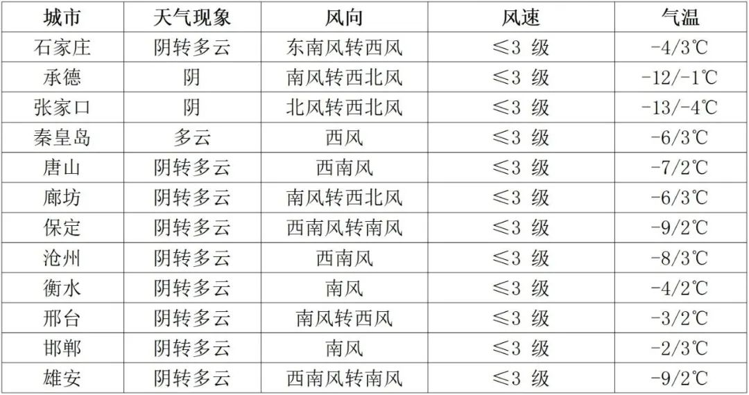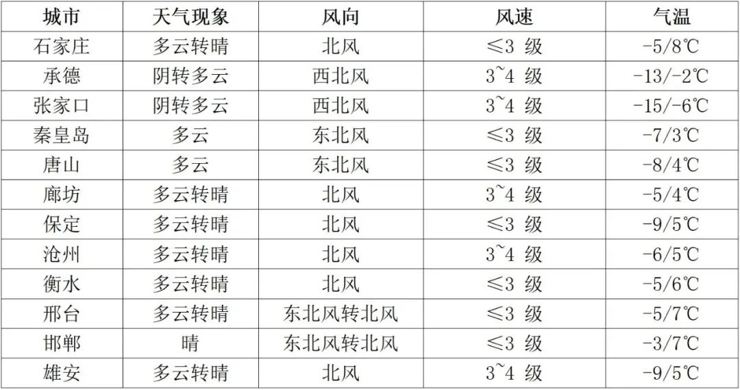 今天白天,全省多云转阴,其中张家口、承德北部有小雪或零星小雪,平原中南部地区有轻度霾。