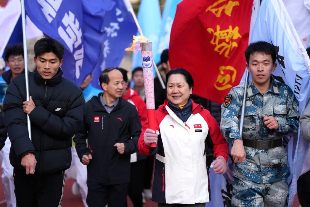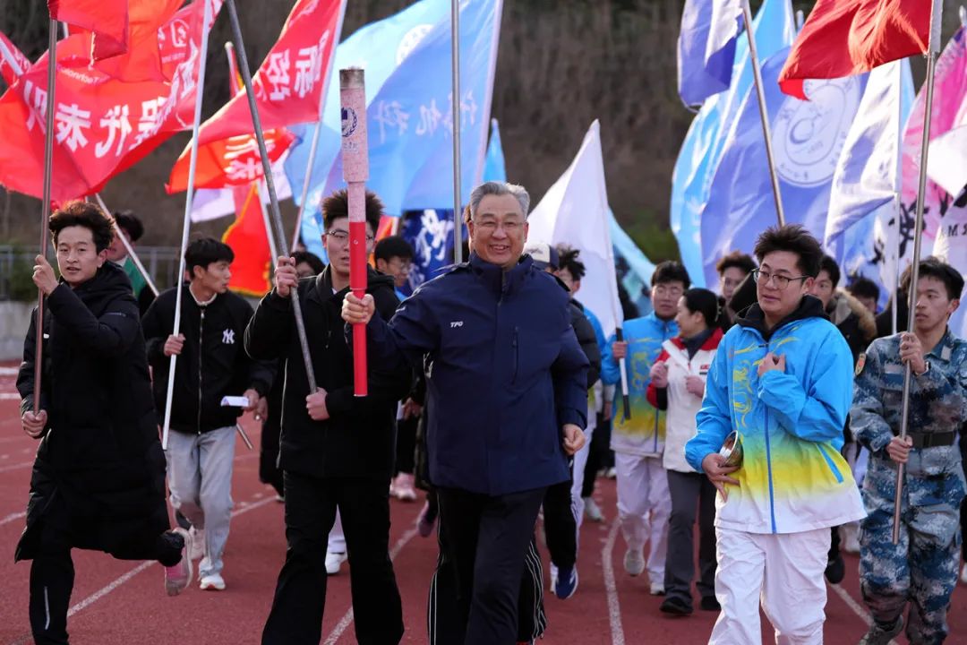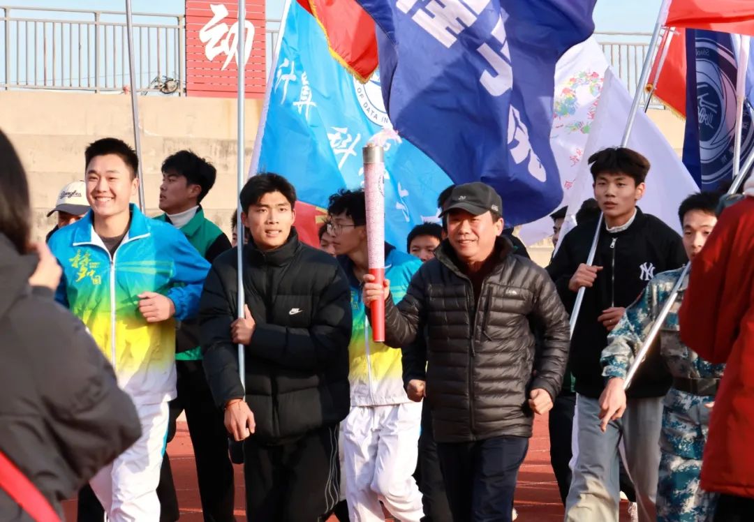 当火炬传递至田径场时,在师生代表的护送下,王少鹏、马红坤、郭迎昌、王凤丽、苏东平接力点燃手中火炬,并共同点燃象征着美好与希望的圣火盆。