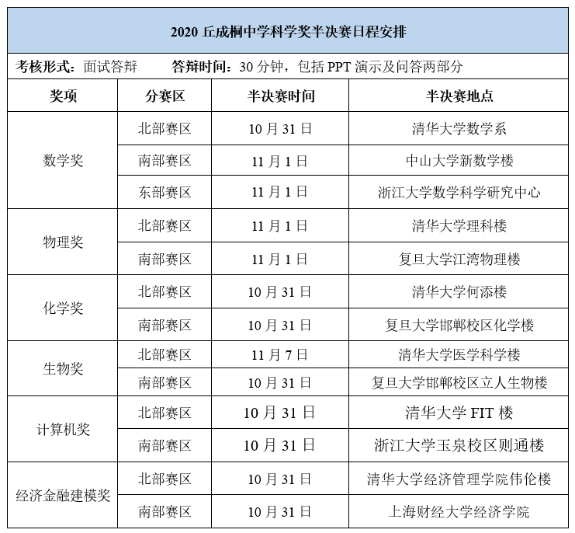 2020丘成桐中学科学奖(简称“丘奖”) 涵盖数学、物理、化学、生物、计算机及经济金融建模六个学科,来自中国内地26个省市自治区、港澳台地区及美国、英国、印度等17个国家400余所中学的1500余支团队、近1700名学生报名参赛,共提交有效论文900余篇。经初筛、函评、桌评等程序,内地13个赛区、亚洲赛区、美国赛区共评选出240余支团队入围半决赛。半决赛将于10月底11月初在各赛区分别举行。内地赛区半决赛日程安排如下: