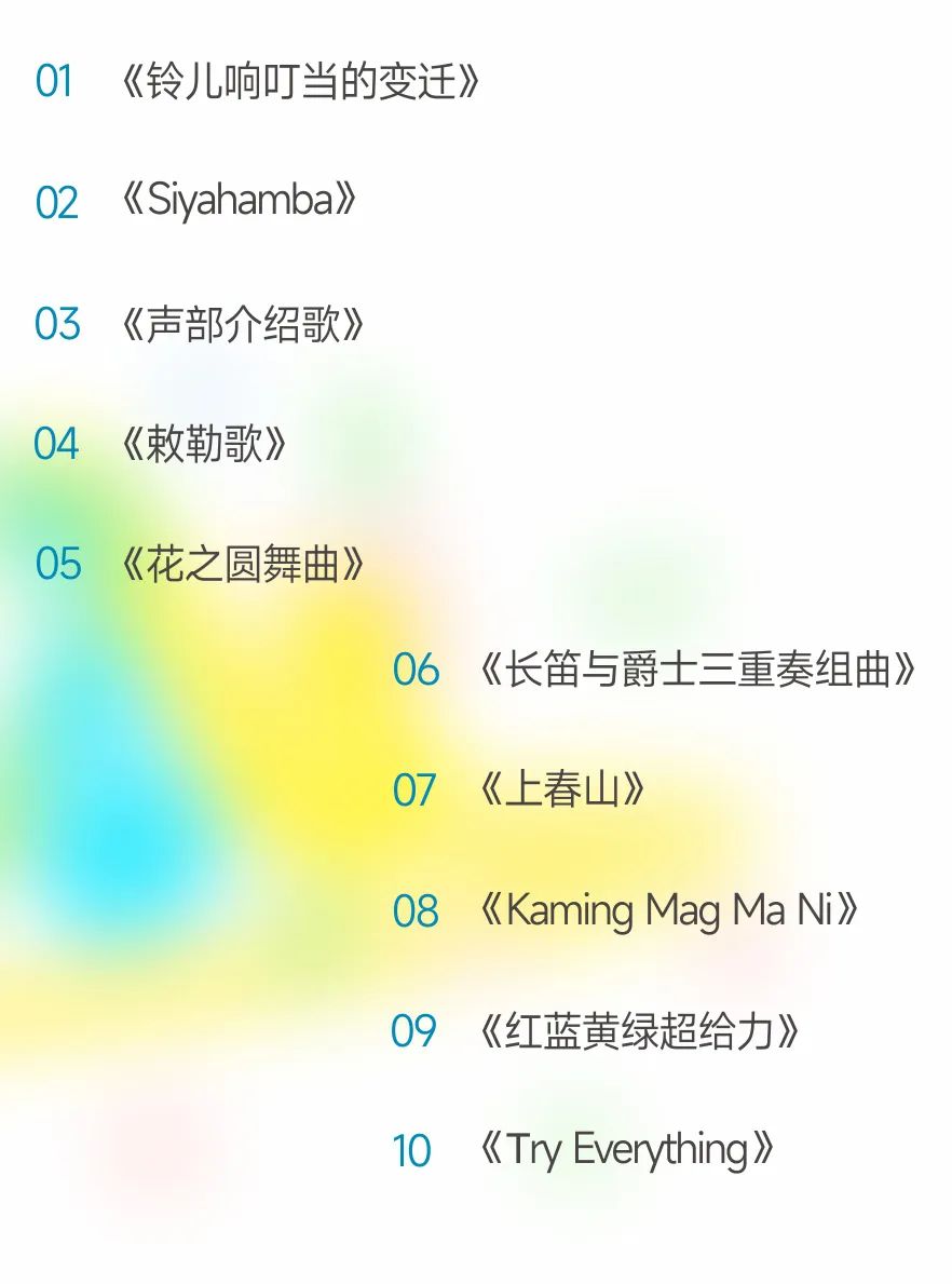01 《铃儿响叮当的变迁》这首歌曲似冰凌欢歌,旋律俏皮如精灵戏雪。铃声悠扬,仿若雪橇驯鹿配饰轻响。歌词绘就冰雪盛景,雪橇行处,笑语铃声交织,寒日满溢热闹活力,引人心生冬之憧憬。02 《Siyahamba》这首歌如南非热情礼赞,旋律活力似火,节奏有力若前行步伐,歌词简洁且深蕴团结奋进之力,令人仿若置身南非大地,随其于光明中高歌奋进。03 《声部介绍歌》它以诙谐之态介绍女高音、女中音、男高音、男低音这四个声部。男低音称暖,女高音高亮,女中音低调温暖,男高音略带傲娇展高音魅力。在演唱过程中,各声部之间相互呼应,相互 “较劲”,仿佛在进行一场有趣的对话,生动地展现了不同声部的特点和魅力。04 《敕勒歌》敕勒川辽阔无垠,天空似穹庐笼罩大地,草原与天际交融,碧草在风中摇曳如浪,羊群似云点缀其间,骏马奔腾,牧歌悠扬。这首歌豪放气魄穿越千年,直抵人心,令人仿若踏入那片广袤而迷人的草原胜境。05 《花之圆舞曲》长笛二重奏《花之圆舞曲》出自柴可夫斯基创作的第三部舞剧《胡桃夹子》。它不仅是舞剧《胡桃夹子》中的重要乐曲,也是柴可夫斯基众多圆舞曲中的杰出代表,以其美妙的旋律、丰富的情感和精湛的作曲技巧,深受世界各地听众的喜爱,被广泛演奏和传播,成为了古典音乐宝库中的经典之作。