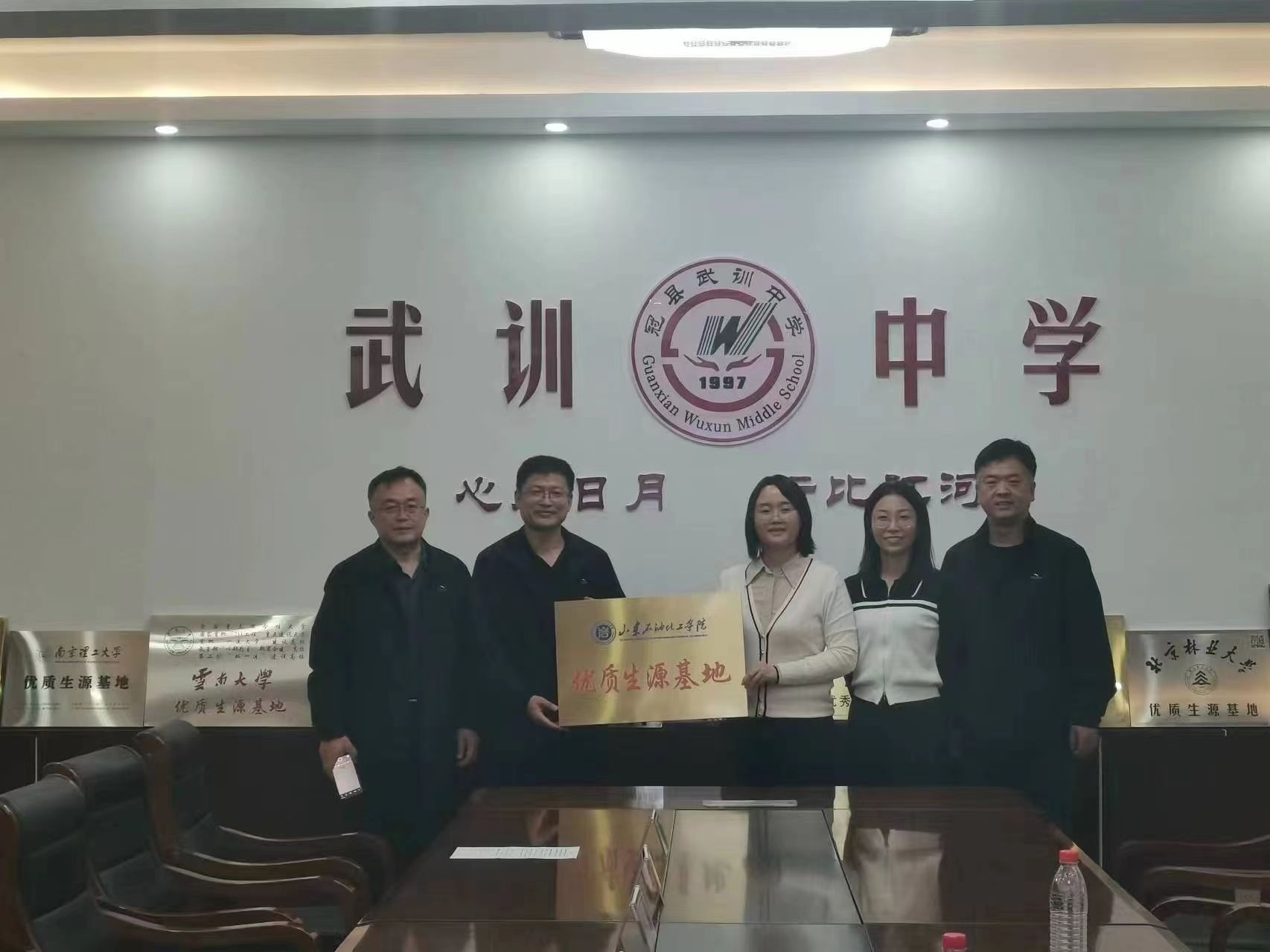 为推进优质生源基地建设,加强与生源中学的联系,4月30日,教育与现代媒体学院院长助理范秀娟、组织员王巍赴聊城走访莘县第一中学、冠县武训中学、临清市第一中学和临清市第二中学,并在冠县武训中学举行了“山东石油化工学院优质生源基地”签约授牌仪式。