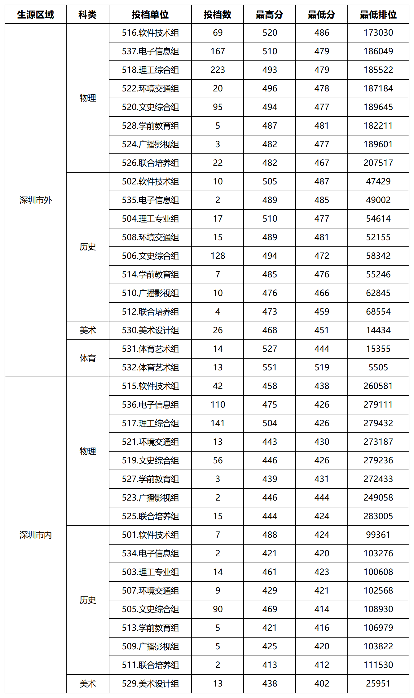 物理类按专业投档录取,智能建造技术最低投档线414分,集成电路技术最低投档线420分,工业机器人技术最低投档线413分,物联网应用技术最低投档线415分,工业软件开发技术最低投档线420分,大数据技术最低投档线423分