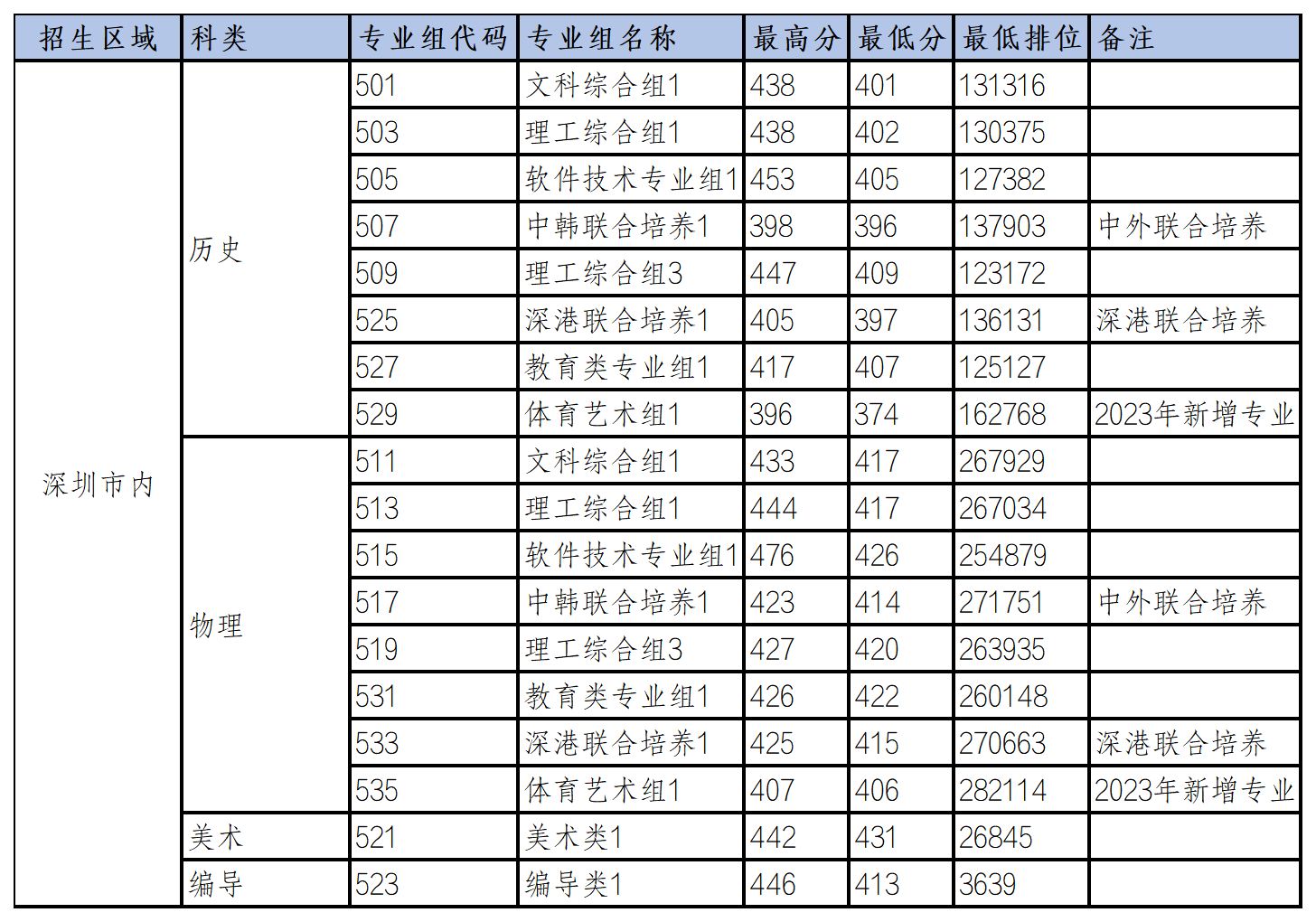 2)深圳市内物理类普通专业组最低投档分数417,最低投档排位267929,相比去年提升22分、32300个排位;