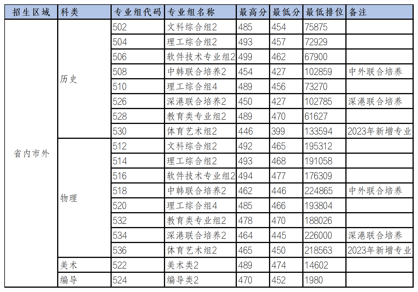5)省内市外最低投档分数超过本科控制线的专业组共计15个,普通专业组(不含中外联合培养、深港联合培养、新增专业)最低投档分数均超过本科控制线。