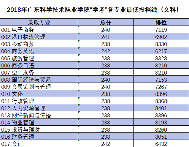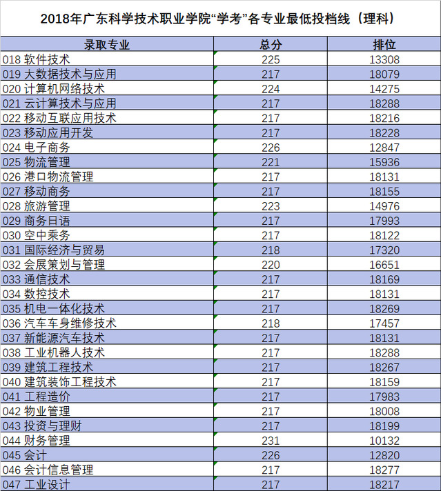 2018年广东科学技术职业学院“学考”各专业最低投档线及排位