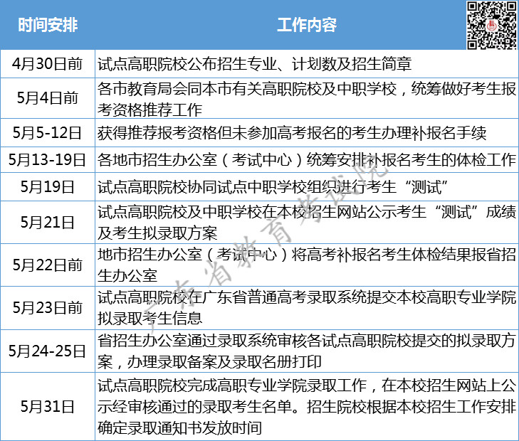 为满足考生报考高职专业学院自主招生的强烈愿望,根据考生诉求,经研究,决定调整高职专业学院自主招生录取有关工作时间安排:一是将考生高考补报名截止时间延长至5月12日16:00,二是调整补报名考生体检时间,三是将试点招生院校测试时间统一推迟至5月19日。具体调整如下: