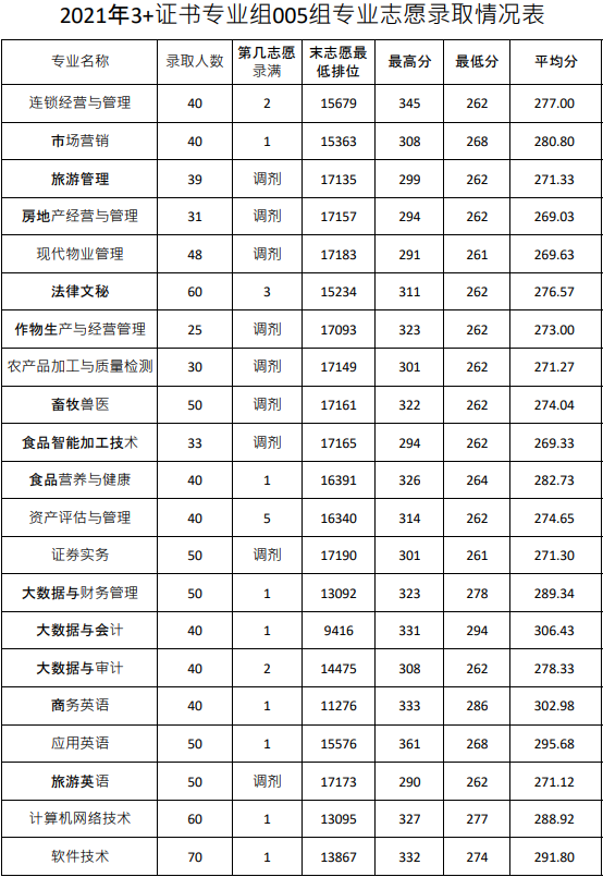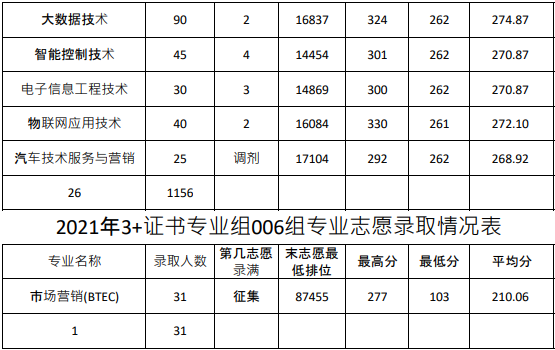 2021年3+证书各专业志愿分数统计:
