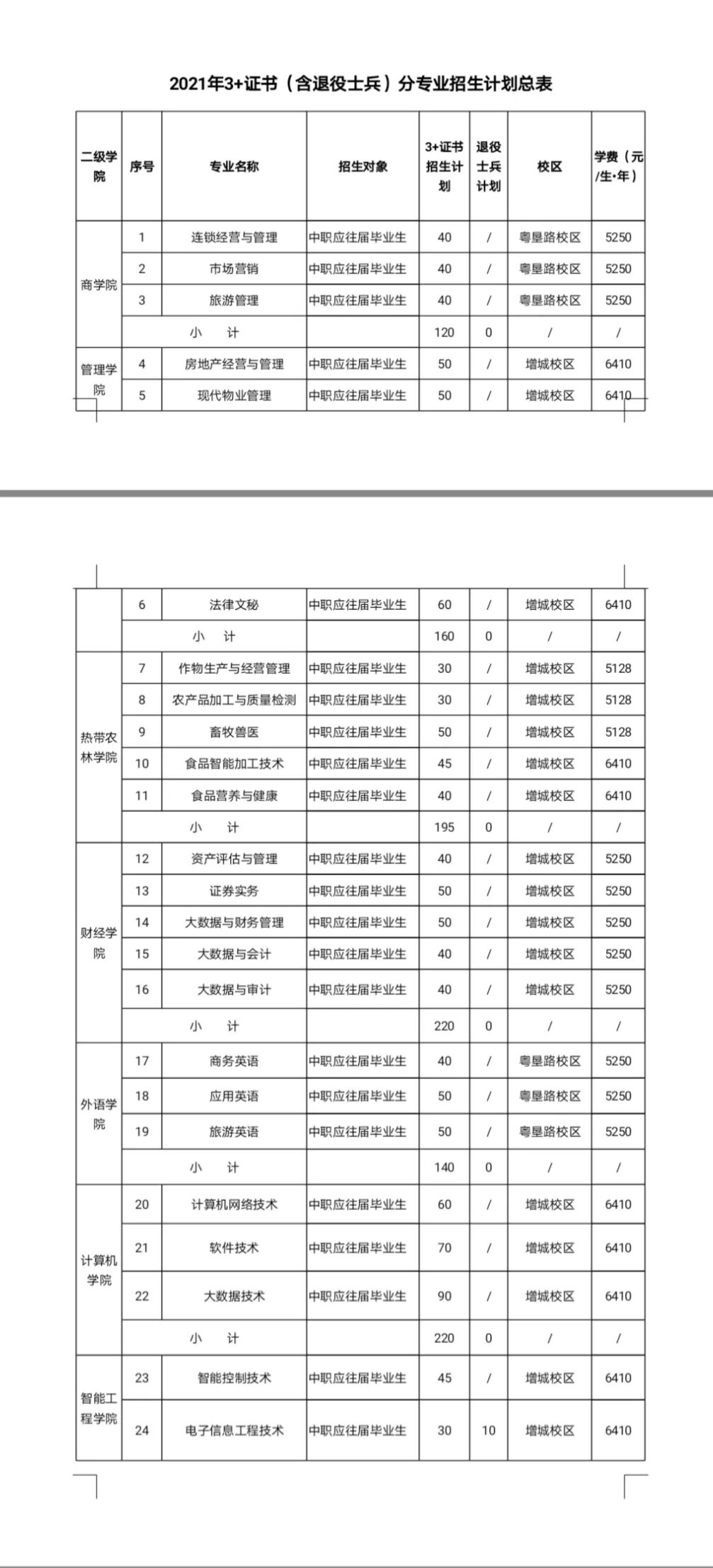 5.招生计划:“3+证书”招生计划1260人,其中退役军人计划40人。