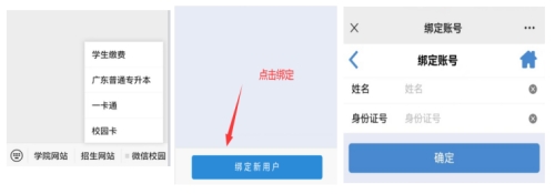 第二步:点击菜单“【微信校园】”,看到【学生缴费】;进入绑定新用户页面,显示绑定账号:输入本人姓名,身份证号,点击确定。