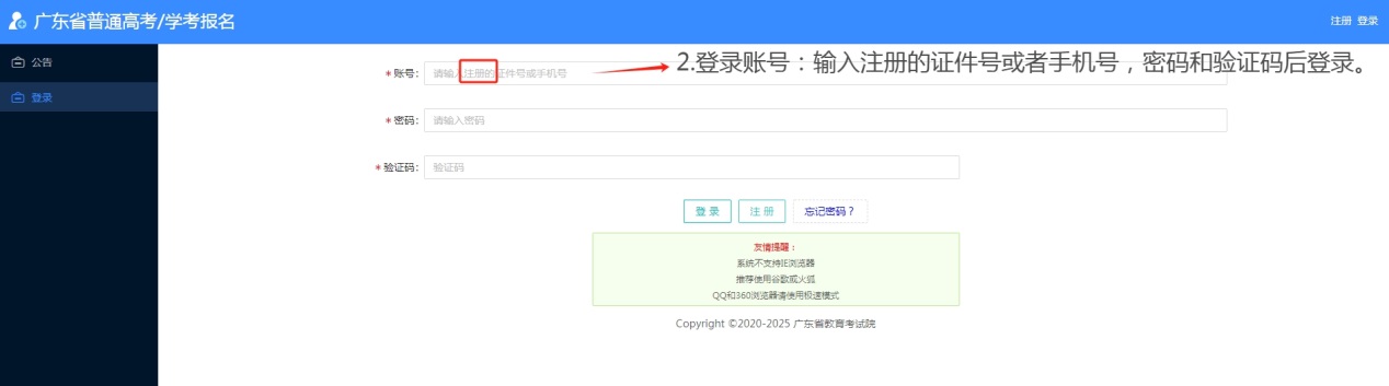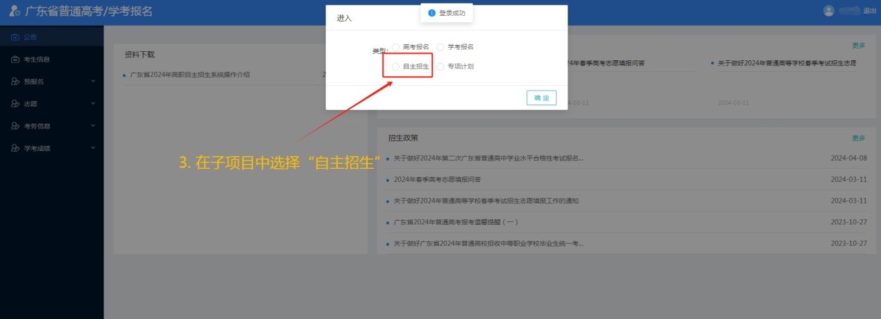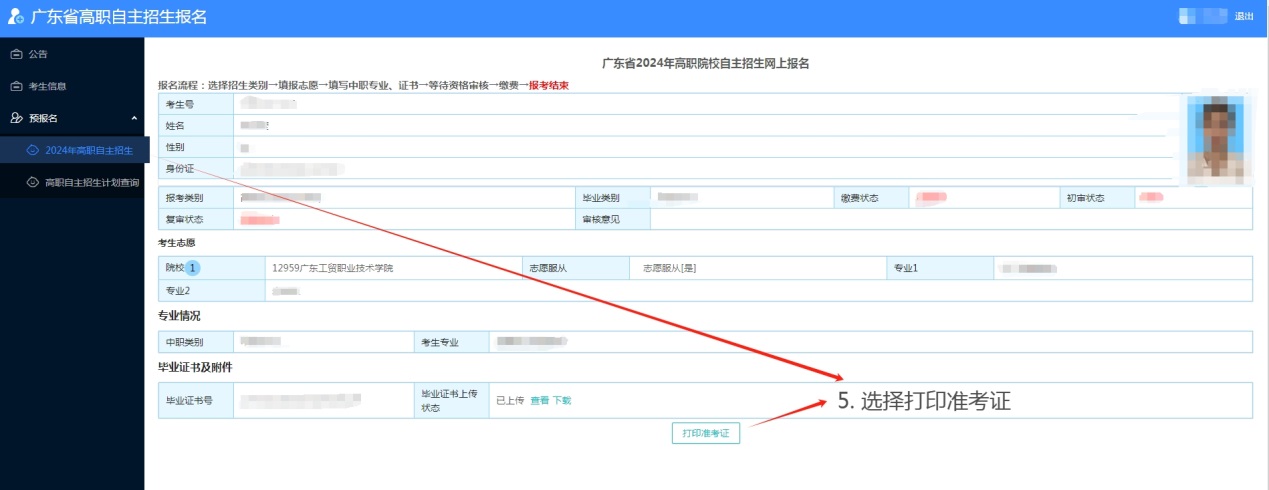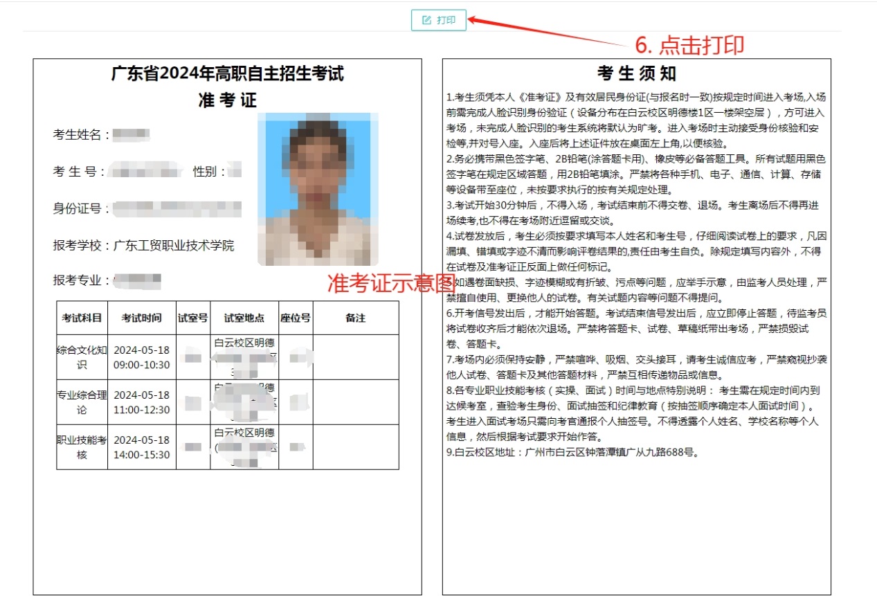2024年5月15-17日考生凭高考报名号及密码自行登录“广东省2024年高职院校自主招生网上报名系统”(下称“网上报名系统”,网址:https://pg.eeagd.edu.cn/gzks/)打印准考证。