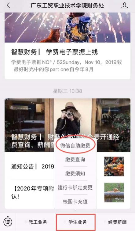附件:“广东工贸职业技术学院财务处” 微信公众号缴纳学费操作步骤