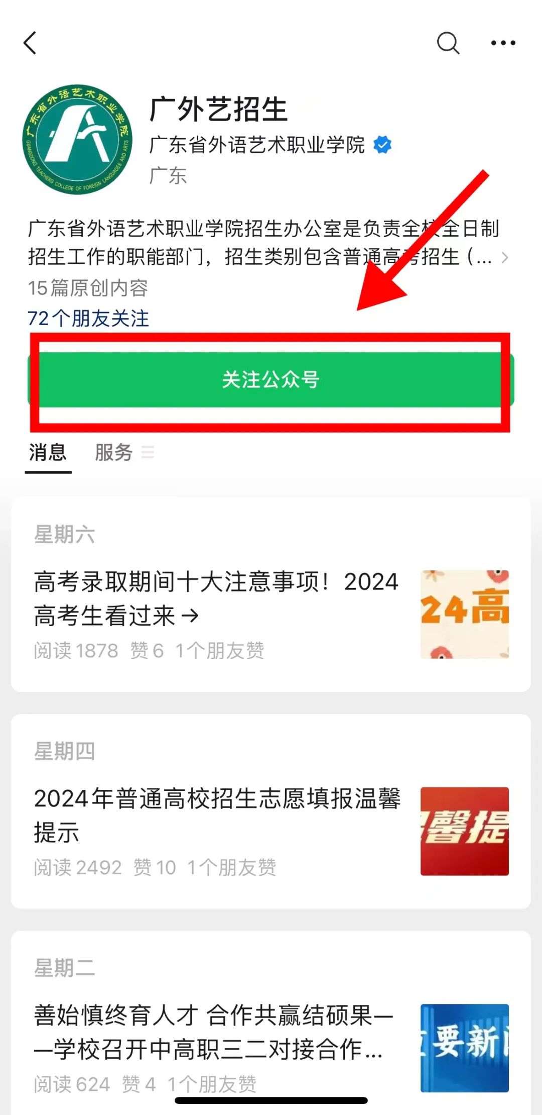 步骤一:手机微信关注“广外艺招生”微信公众号;