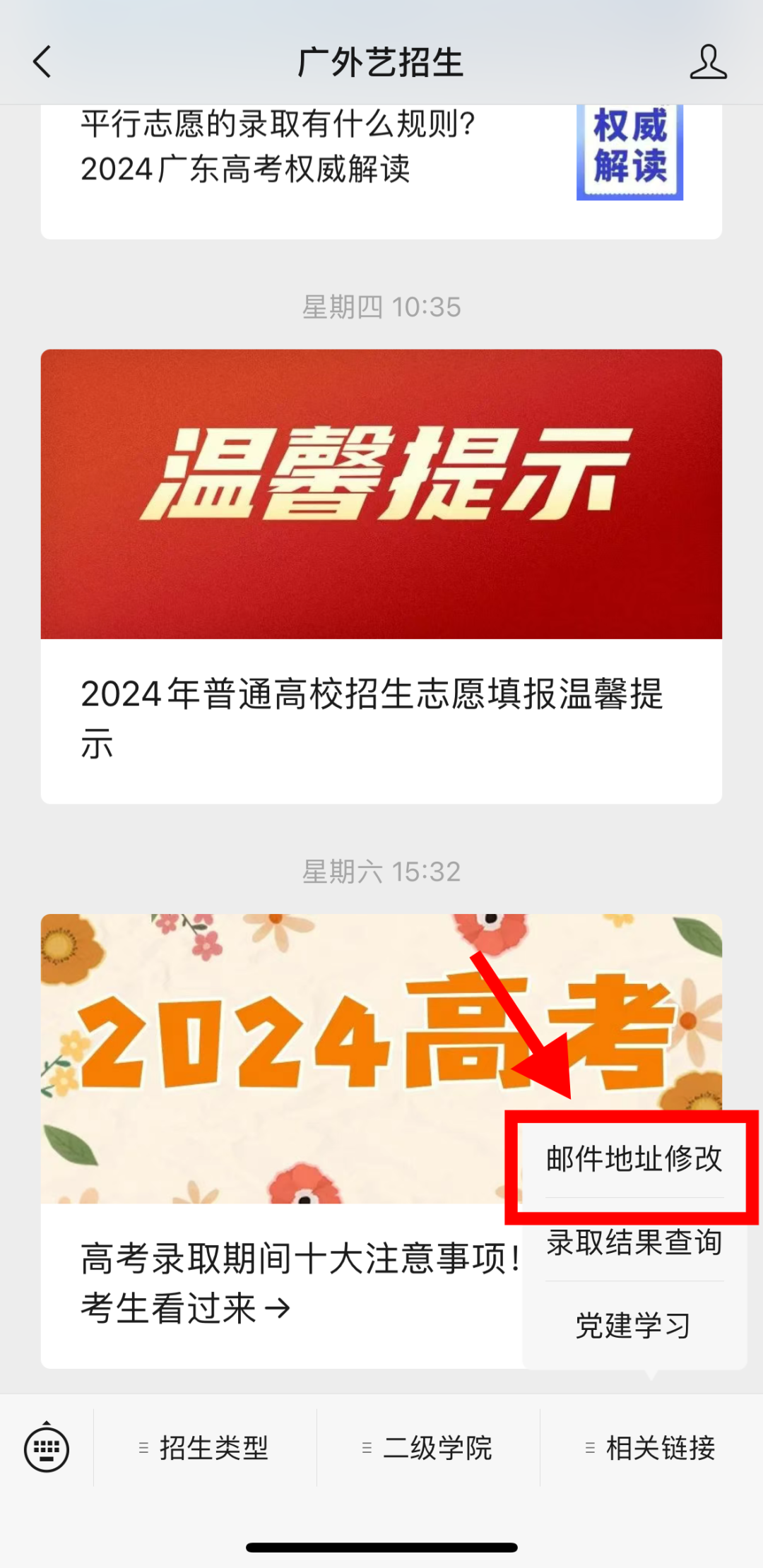 我校2024年第一批录取通知书将在7月通过邮政EMS快递寄出(按照考生在报名系统里留存的联系人、联系地址寄送),第一批录取通知书的招生类型为:1、3+证书2、中高职贯通三二分段转段3、五年一贯制(全省统考)4、自主招生(面向中职毕业生)5、自主招生(普通现代学徒制)为了确保各位被录取考生都能如期收到录取通知书。特此提醒:原先由于个人原因的收件人、收件地址不正确或者有变化,需要修改录取通知书收件人、收件地址的同学,可根据以下方法进行操作(切记!如无必要修改的,请不要进行地址更正,以免造成混乱):方法一: