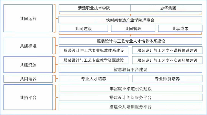 依托中国快时尚智造基地和广州北中大时尚科技城,清远职业技术学院与忠华集团共同组建了快时尚智造产业学院。产业学院重点围绕纺织服装产业链中的服装设计、服装制版、生产管理、产品检测、数码印花、电商直播、物流管理等岗位群实施校企双元育人。快时尚智造产业学院,构建了“共同运营、共建标准、共建资源、共同培养、共搭平台”的运行和管理机制,探索出了一条产教“真融真合”的新路径。产业学院校企共同制定人才培养方案、开发课程教学资源、共组双导师授课团队、共同实施教学和课程考核评价,同时将服装行业先进技术、优秀企业文化融入教育教学全过程。通过三到五年建设,打造成集“人才培养、培训鉴定、技术开发、成果转化”四位一体,互利共赢的产业学院,为广清纺织服装产业有序转移园区企业定向输送高素质技术技能人才,也可为园区中小服装企业提供产品设计、制版、人力资源培训等服务,促进地方经济高质量发展。