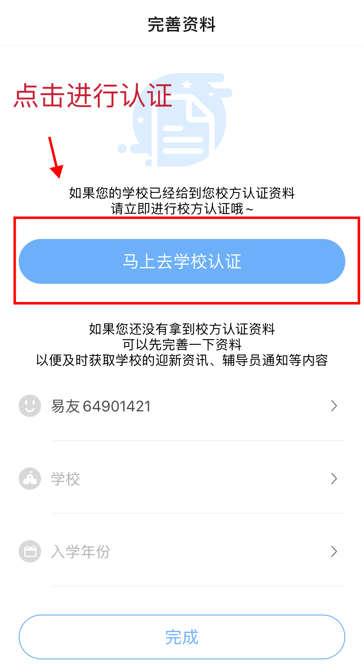 3.校方认证。点击“马上去校方认证”,进行身份认证(学生填身份证号进行认证),立即认证。