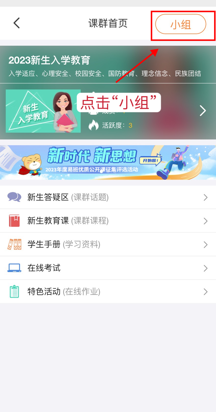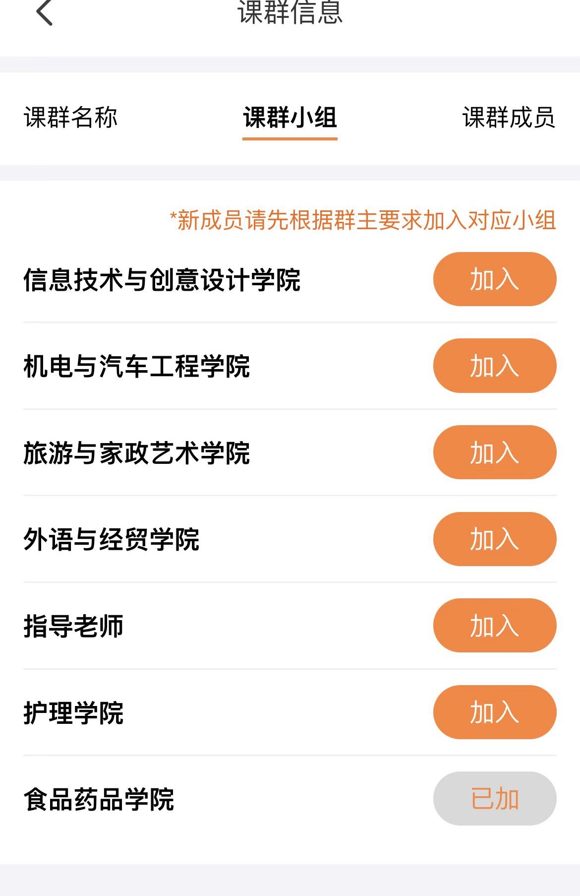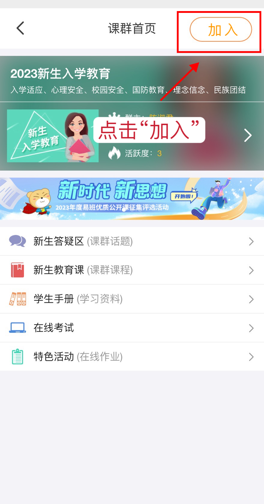 3.登录账号后点击右上角“加入”按钮,加入2023新生入学教育优课课群。根据所属二级学院的院系,选择加入小组。