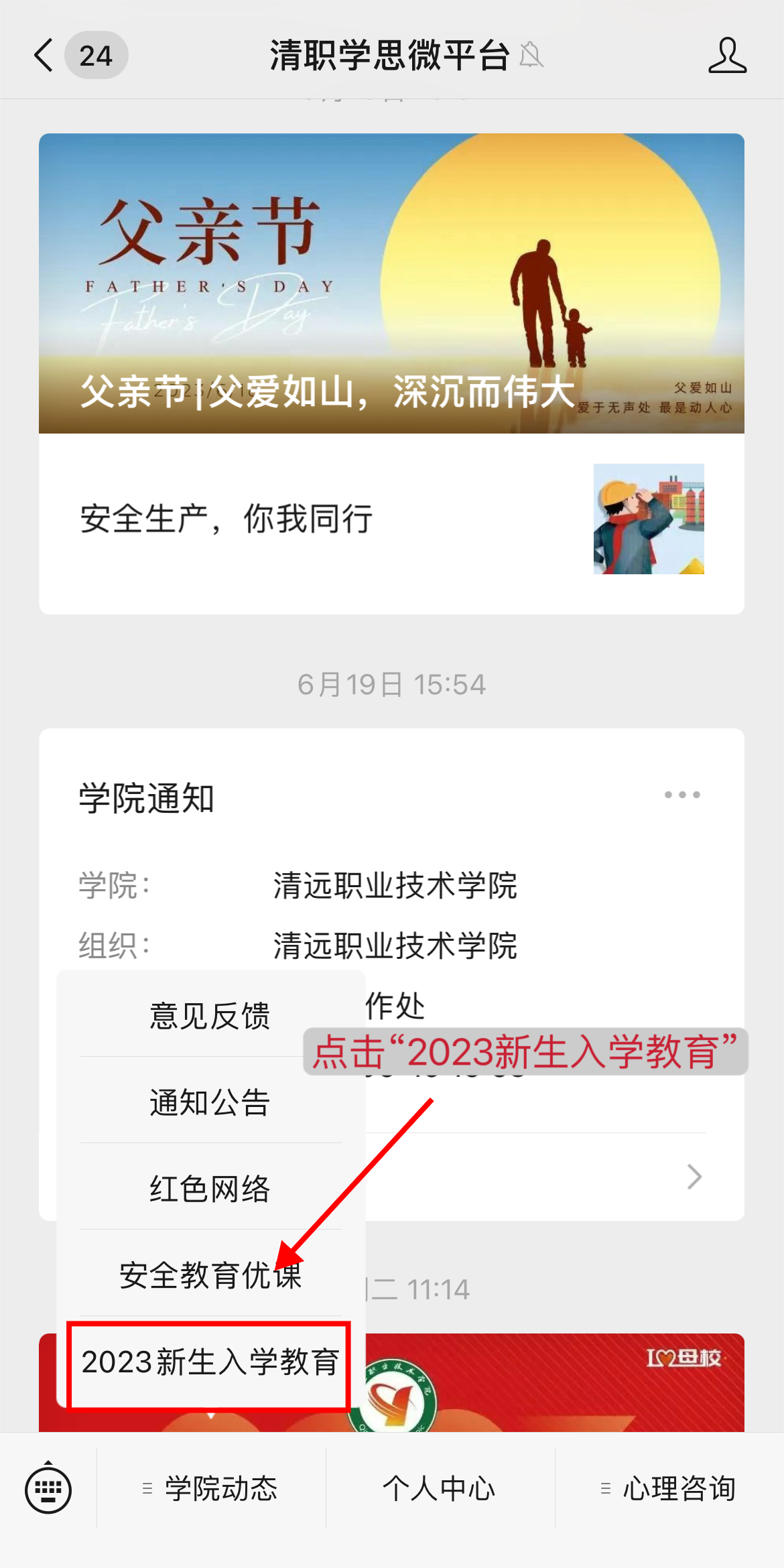 (2)打开微信,搜索“清职学思微平台”,点击左下角-学院动态菜单,点击第五项-2023新生入学教育。