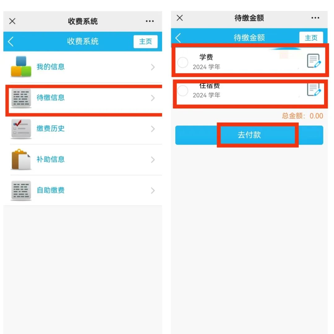点击“待缴信息”,选择缴费项目,点击“去付款”,完成微信支付。