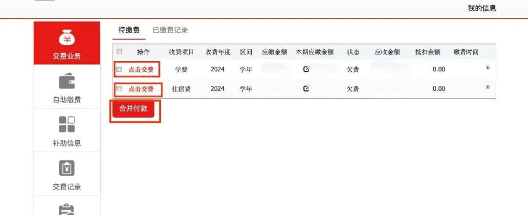 点击“点击缴费”或勾选两项以上后点击“合并付款”,选择收费方式支付,支持微信、支付宝、银联等支付方式(如缴费金额大于银行卡支付额度的,请分次缴费)。