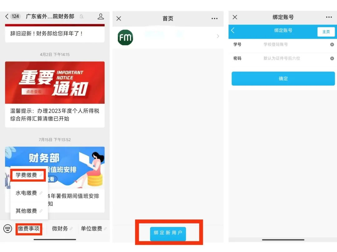 点击“缴费事项”—“学费缴费”后,绑定新用户。输入学号或考生号(新生为14位全国考生号,广东考生在10位考号前+2444,即录取通知书上的考生号)及密码(初始密码为本人身份证号后六位,字母、每边括号算一位)。