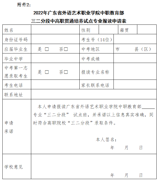 附件2:2022年广东省外语艺术职业学院中职教育部三二分段中高职贯通培养试点专业报读申请表