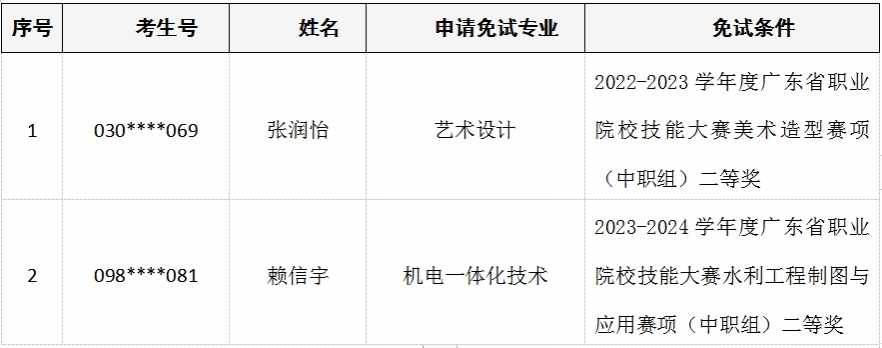 根据广东省教育厅、广东省退役军人事务厅《关于做好2024年高等职业院校自主招生工作的通知》(粤教考〔2024〕4号)文件要求,我校2024年普通高职自主招生(面向中职生)接收在省级(含)以上行政部门主办的职业技能大赛获二等奖及以上的考生申请免试入读,在5月9日-5月12日报名期间,共有2名考生递交免试申请材料,经核实学生资料、审核申报资格等环节,符合申报要求,现予以公示。