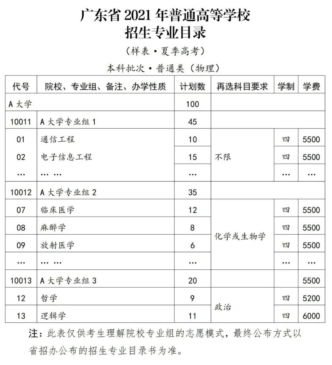 “院校专业组”指的是某一高校对考生选考科目要求相同的专业(类)的组合。 一所院校可设置一个或多个“院校专业组”,每个“院校专业组”内可包含数量不等的专业(类)。 同一“院校专业组”内各专业(类)对考生的选考科目要求相同。 同一院校选考科目要求相同的专业(类)也可分设在不同的院校专业组中。 例:“A大学专业组1”选考科目要求为首选科目物理、再选科目不限,包括通信工程等若干专业;“A大学专业组2”选考科目要求为首选科目物理、再选科目化学或生物学,包括临床医学等若干专业。如考生首选科目为物理,再选科目为化学、生物学拟报考A大学通信工程和临床医学2个专业,则应填报 “A大学专业组1”和“A大学专业组2”两个院校专业组志愿,并分别在两个院校专业组中填报通信工程、临床医学专业志愿(《广东省2021年普通高等学校招生专业目录(样表·夏季高考)》见下表)。