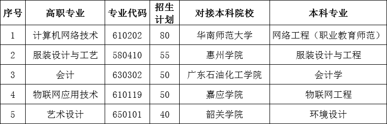 为贯彻落实《国家职业教育改革实施方案》(国发〔2019〕4号)和《广东省职业教育“扩容、提质、强服务”三年行动计划(2019-2021年)》(粤府办〔2019〕4号),广东省教育厅组织开展2020年高职院校和本科高校协同育人试点工作。在校领导的牵头下,我校2020年专升本协同育人试点较往年取得了突破性的进展。根据《广东省教育厅关于开展2020年高职院校和本科高校协同育人试点工作的通知》文件要求,我校继与惠州学院对接服装设计与工艺专业试点之后,新增与华南师范大学等4所公办本科高校三二分段专升本协同育人试点。试点项目5个专业共275个招生计划将通过广东省夏季高考面向普通高中应往届毕业生开展招生,与本校其他专业同批次录取,单独编班。具体试点专业和计划详见下表: