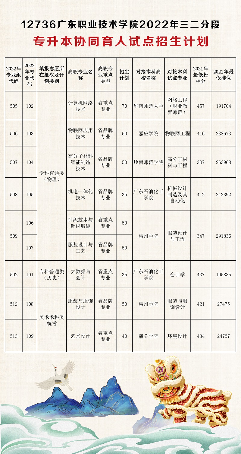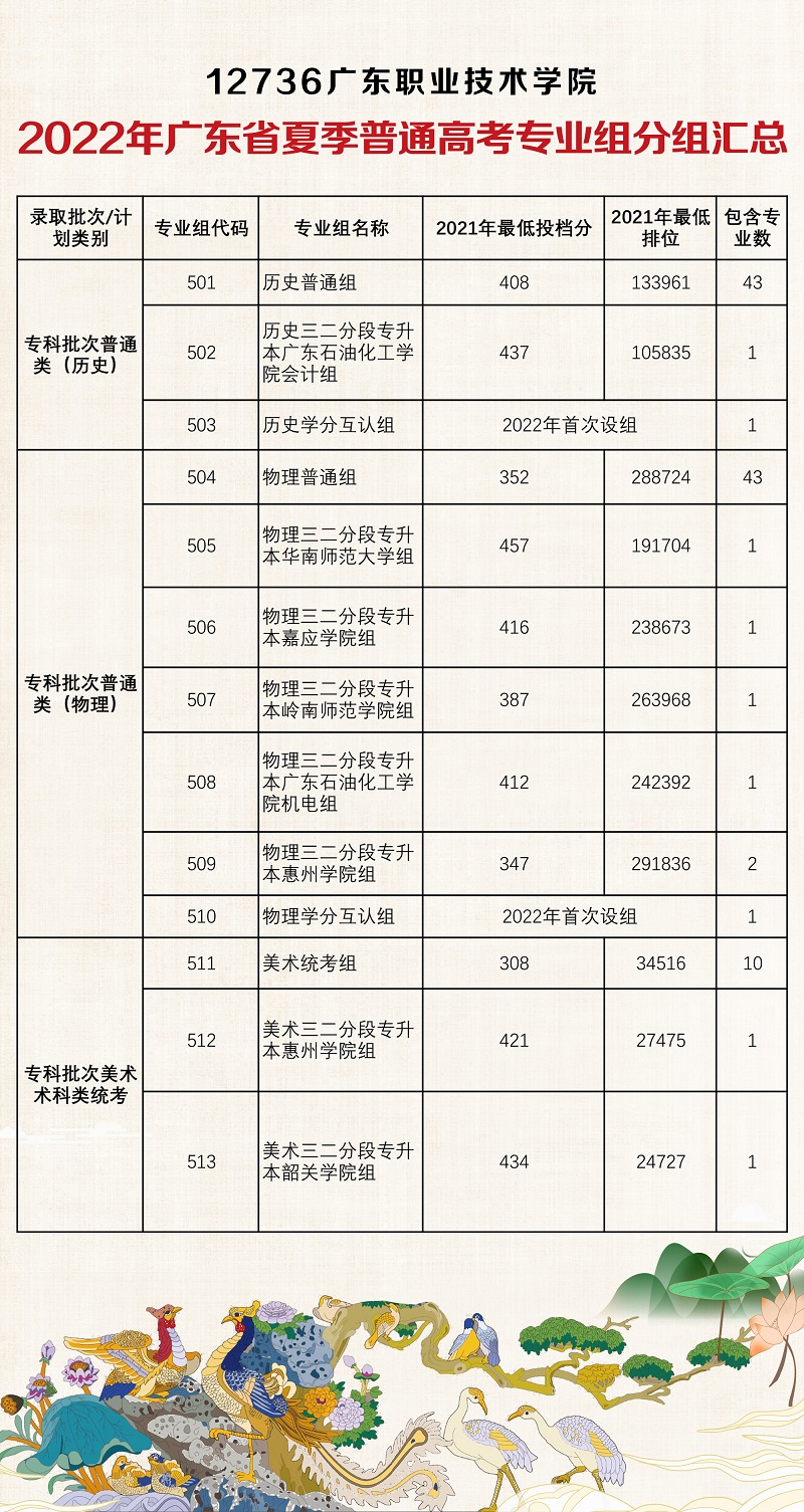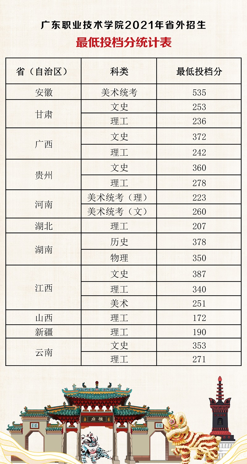 广东职业技术学院2021年夏季普通高考各专业组最低分最低排位