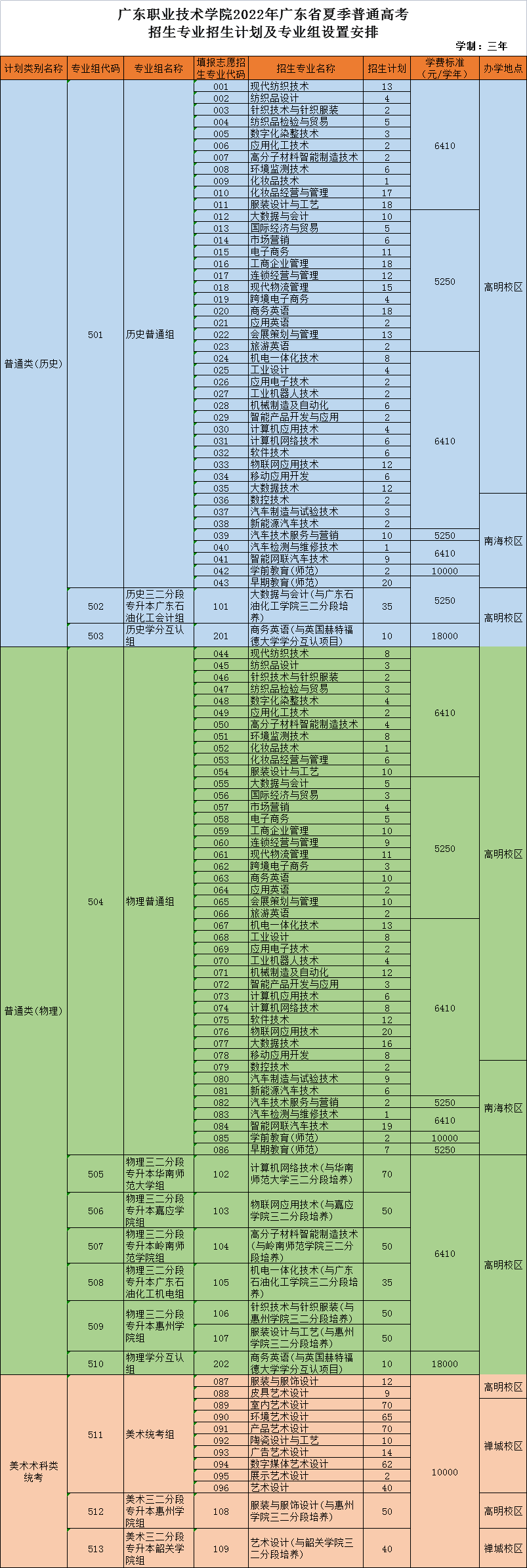 广东职业技术学院(学校代码12736)2022年夏季普通高考广东省招生计划及专业组设置安排