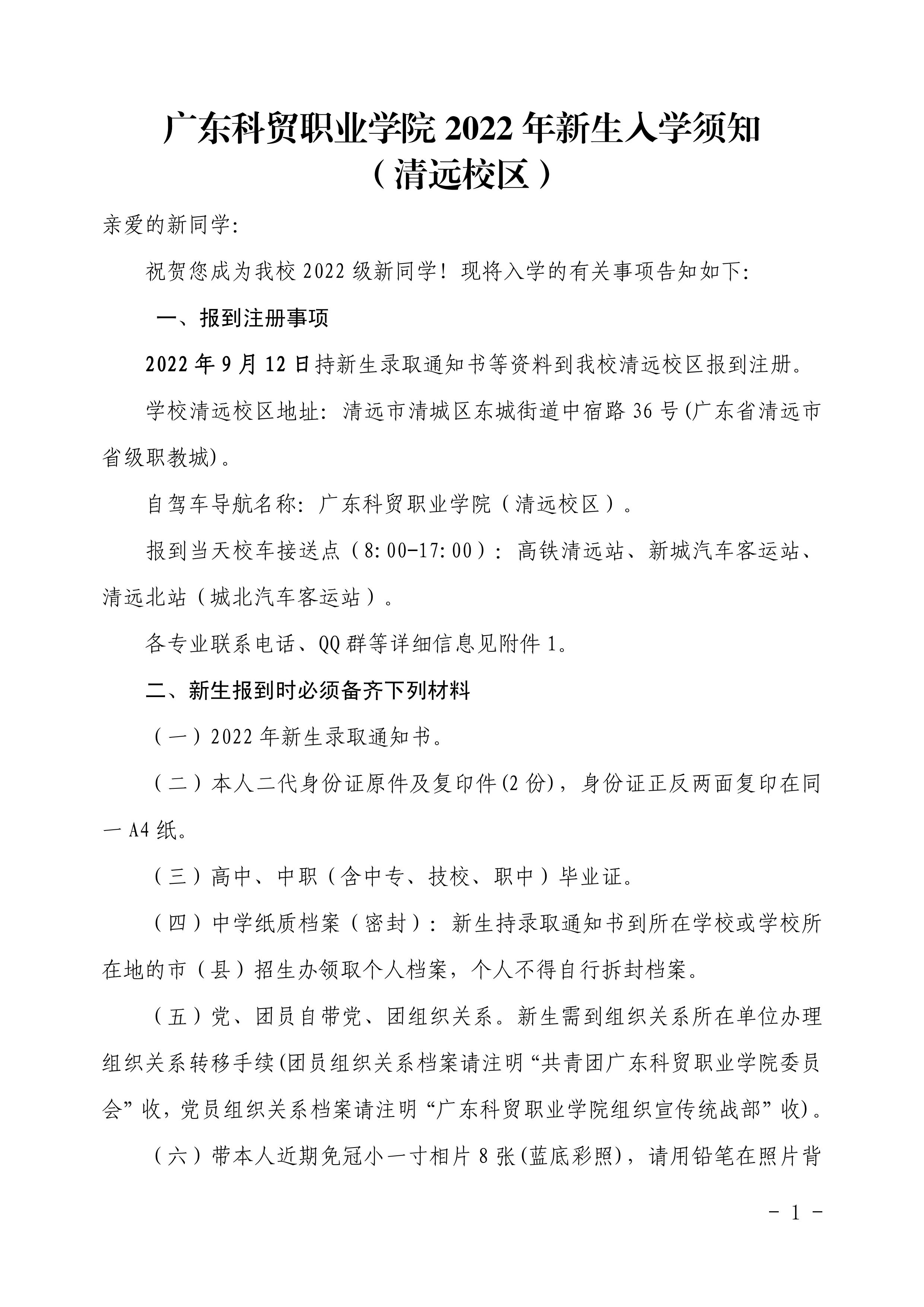 广东科贸职业学院2022年新生入学须知(清远校区)