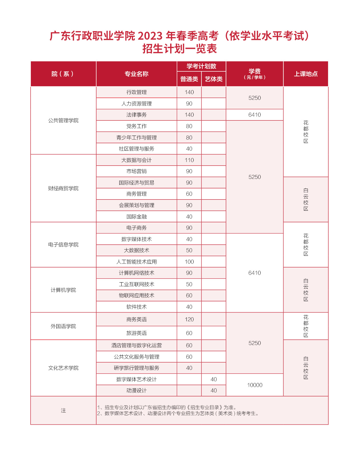 广东行政职业学院2023年春季高考(依学业水平考试)招生计划一览表