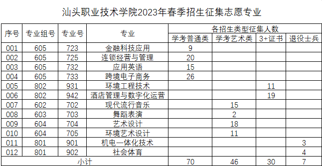 汕头职业技术学院2023年春季招生征集志愿的公告