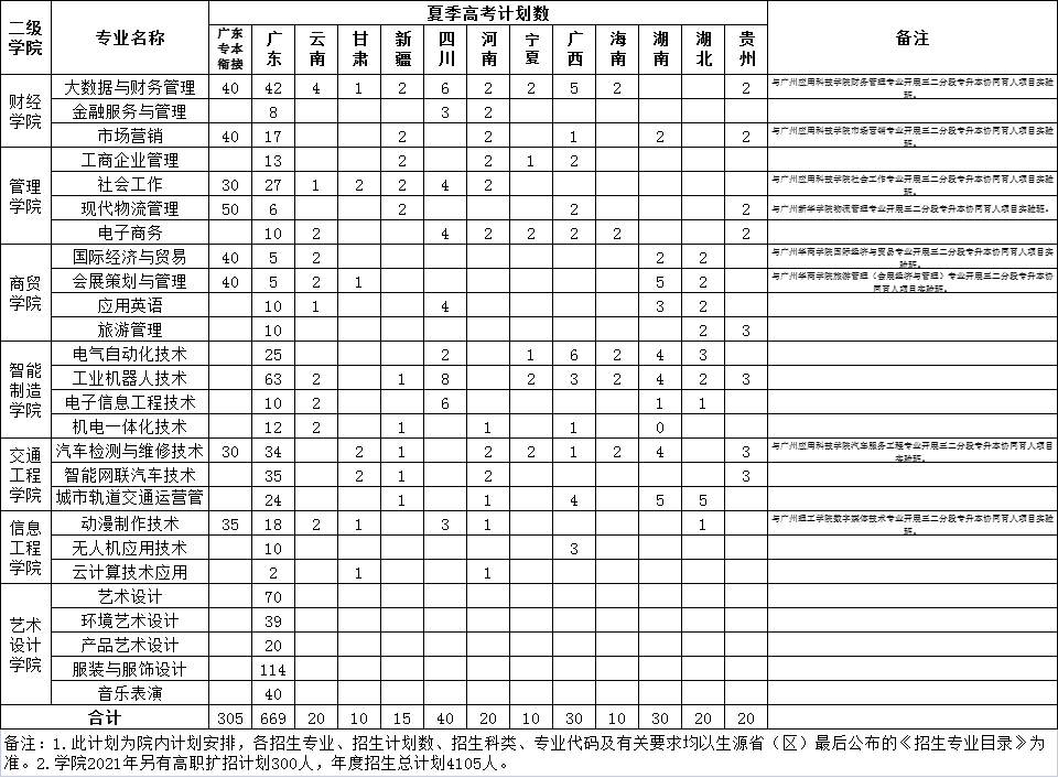 广州科技贸易职业学院2021年夏季高考各省区招生计划一览表